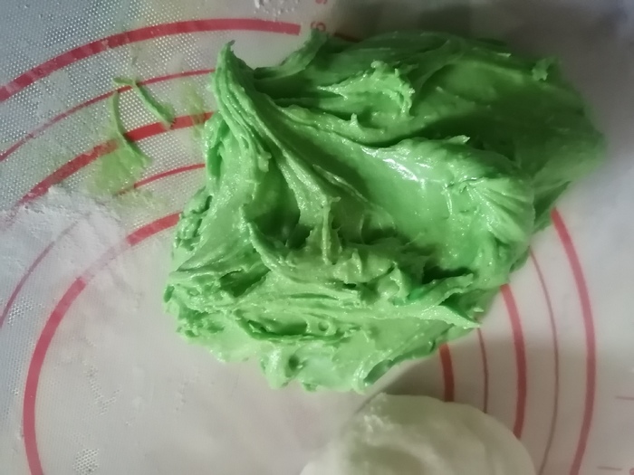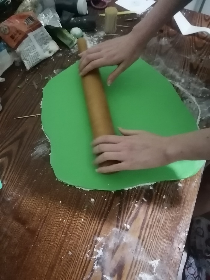 Мастика нашего производства оказалась очень липкой и было принято решение, дать ей ещё немного времени подсхонуть. Лепить мы начали из покупной. Цвета передаются хорошо, как мастике так и пальцам, по этому, если кто-то будет красить, лучше всего это делать в перчатках.