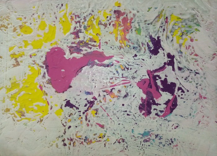 Нарисовала я значит взрыв мозга, решила, чтобы не трескалось, покрыть лаком. Поискала у мамы лак, вижу стоит банка, написано лак акриловый, но он был почему то белый. Подумала, мама же говорили, что он должен быть белым, потом высыхает и становится прозрачным) так обрадовалась, пошла красить) проверила на бумаге, вроде правда становится полупрозрачным) получился белый прямоугольник, да ещё и рельфный) потом спрашиваю маму, когда он высохнет? Мама говорит, скоро. Потом я спрашиваю маму: а это лак у тебя? А там оказывается написано акриловая ЭМАЛЬ) Я все поняла. И пошла отмывать эту эмаль кипятком) вылила на картину 2 чайника и стала тереть губкой. Оттерля, что оттерлось. Показала маме, ей понравилось говорит получилась карта) Я не могу понять, что это может быть за карта)