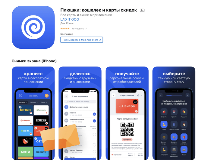Приложение весит всего 19 Мб и спасает от того что бумажник вот-вот лопнет от пластиковых карт. Оно сохраняет все ваши скидочные карты из разных магазинов. Мне очень понравилась идея этого приложения - больше не приходится тупить на кассе магазина роясь в многочисленных кусках пластика, потому что часто используемые мной карты у меня всегда находятся вверху списка Плюшек. Классно, что теперь, благодаря Плюшкам, я могу поделиться своей максимальной скидкой на запчасти с другом и с тестем. Ему у меня хоть и за 60, но приложение тоже пришлось по вкусу.