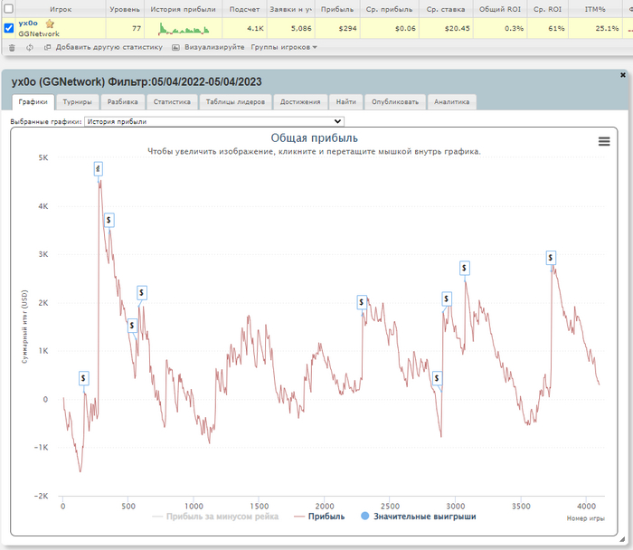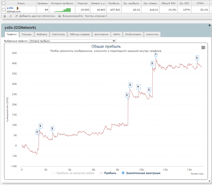 На графике видно, что общая дистанция игра в одном из румов составляет - 15.030 турниров, с общим профитом в $37.921. В среднем современный профессионал отыгрывает в год ~4800 турниров, и если следовать данной логике, то средний профит в месяц у меня к примеру вышел бы - $1011. Но помимо чистого профита, современные площадки для игры в покер предоставляют еще множество бонусов, такие как рейкбек (аналог кешбека), бонусы, фриролы, плюшки и всякие прочие мелочи за большую активность, и по факту сумма конечно выходит поболее.