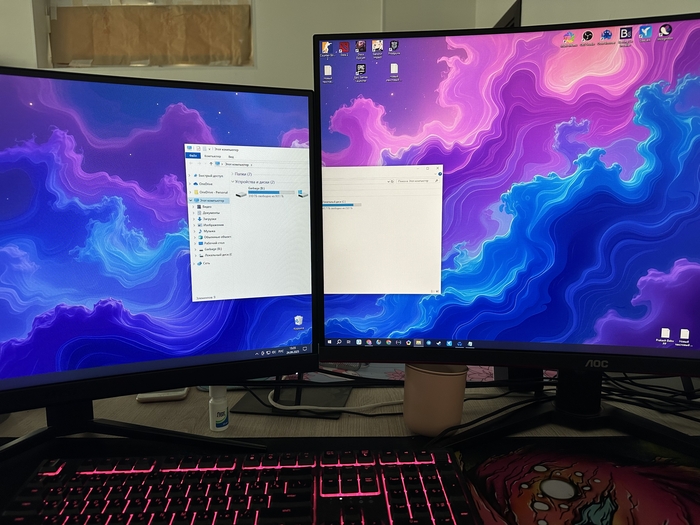 Друзья, помогите советом, пожалуйста! Не могу настроить масштабирование мониторов так, чтобы размеры окон с левого монитора были равны размерам окон справа. Пробовал переставлять кабели местами, ставил драйвера, менял масштаб справа на больший, но становилось еще хуже, лазил в настройках самих мониторов-ничего не помогло.