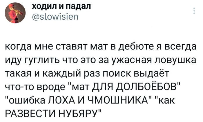 Скачал одно не самое торговое приложение по шахматам, там где игроки в основном из южной Азии. Заметил тенденцию, что на начальном уровне каждый наглец старается влепить мне детский мат, когда играю черными. В основном заканчивается так