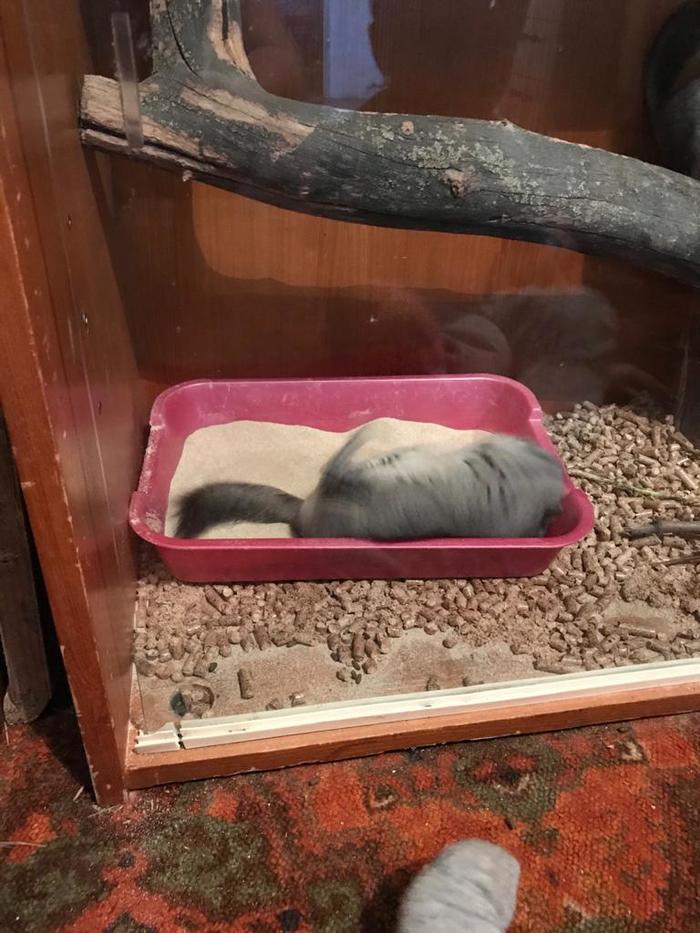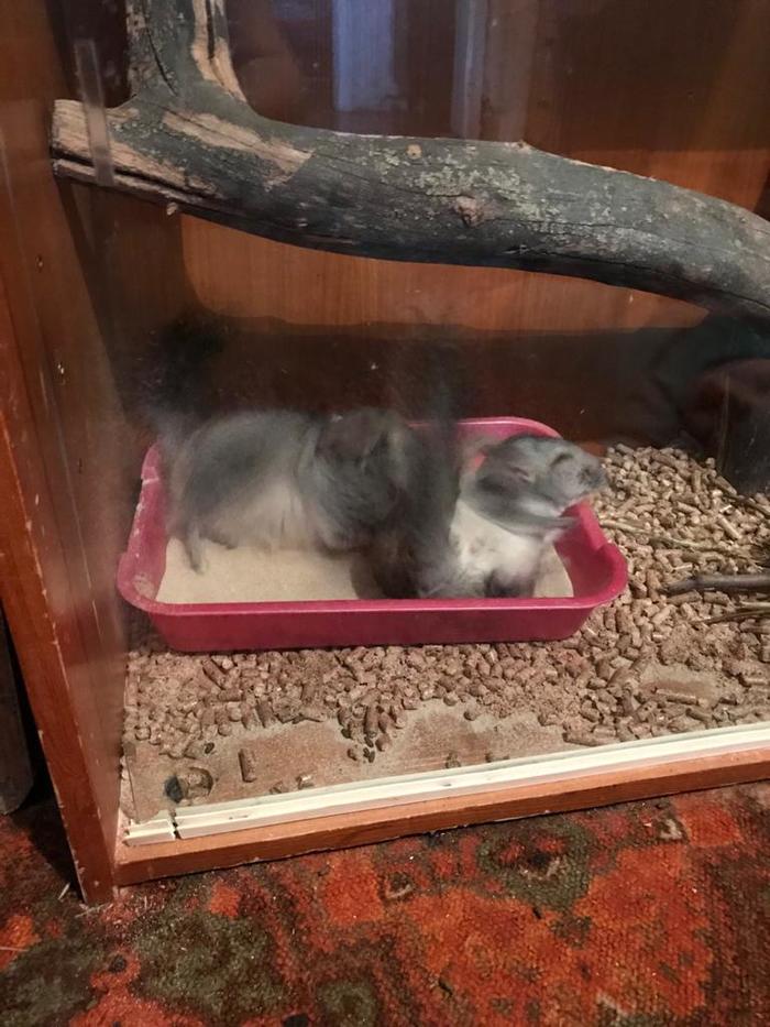 А вот с купанием процесс особый. Это не кошка, вылизывать Шуша (и Бендер) себя не будут. Плюс, анатомией заложено отсутствие потовых желез, отчего мыться шиншилла может только внешними способами. В любом зоомаге есть специальный вулканический песок. Он как бы обычный кварцевый, но очень мелкий. Стоит банка 190 рублей. Тут не нужно экономить и воровать со стройки обычный - крупными песчинками кроликобелка убьет свою шубку и в дальнейшей перспективе ваша потенциальная шапка будет смотреться бедно. Песок после приобретения насыпаете, например, в старый кошачий лоток и ставите в вальер. А дальше сидите и умиляетесь. Шиншилла будет барахтаться в нём как сосиска на гриле, выглядит очень умилительно. После купания распушится и побелеет (всё норм, просто в песок производитель добавляет тальк). Главное не оставляйте им песок на постоянку. Накупавшись, шиншиллы тут же организуют в нём сортир и вы задолбаетесь ходит в магазин за новым песком. Минут 20 по два-три раза в неделю им вполне достаточно: