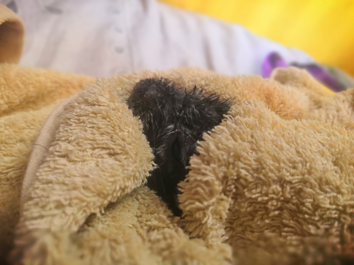 Когда животное слегка обсохнет, вынимаем его из полотенца - оно все равно уже намокло. Далее шиншилл кладем за пазуху и греем. Если зверек дрожит - накрываемся пледиком или одеялком. Перегрев они сейчас не получат - вода при испарении их охлаждает.