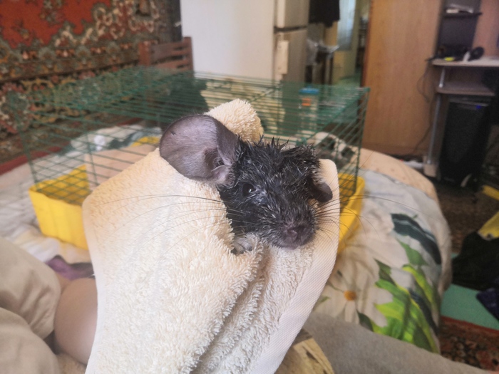 После купания делаем шиншиллячью шаурму. То есть, обтираем животное сухим полотенцем и заворачиваем его в другое сухое полотенце, берем на ручки и сидим минут 30-40 до практически полного высыхания.