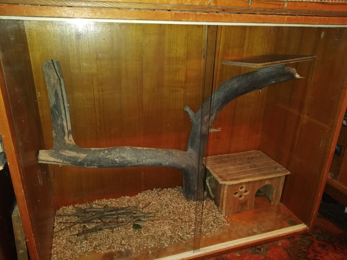 И на том же фото вы увидели целиком клетку. Если вы мажор, то можете заказать её в интернете. Нормальная клетка стоит в районе 20 косых. Если вы нищеброд, для коих и создан пост, то бегите к бабушке в деревню или на тоже Авито. Шиншиллам желательно большее пространство, я не зря называю их кроликобелками. Зверьки весьма подвижны, им нужно место побегать, а лучше попрыгать. Если вы видели в интернете видео про плюшевых и неуклюжих шиншилл, знайте - вас обманули. Зверьки весьма юркие, при побеге из клетки доставляют много проблем (хрен ты их поймаешь). В клетке же зачастую показывают чудеса паркура: хреначат в высоту в несколько раз больше своей, прыгают от стен, пару раз видел даже сальтухи. Но это уже лирика. Касаемо самой бюджетной и просторной клетки. Вас выручит (голосом Левитана) СОВЕТСКИЙ шкаф. Похрен какой, но лучше со стеклянными дверцами. Цена этой рухляди, равна... Да можно хоть на помойке найти. Я вот в гараже нашёл и немного переделал. Берём пару дощечек и делаем полочки. Если осталось место, берём любую корягу и прибиваем внутрь. Корягу главное не косточковую, грызунов всё же содержим. Они грызут всё, до чего дотянуться. Я своим кроликобелкам сделал двухэтажную клетку, соединенную небольшим отверстием, но вы ограничены только своей фантазией: