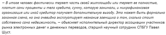 Задолженность недобросовестных заемщиков платят заемщики добросовестные, говорят специалисты. Если разложить кредит, который вам выдают, то 40% составляют долги других лиц, еще 20% — процент кредита, столько же — аренда офиса и зарплаты сотрудникам, остальное — реклама МФО. Высокая цена микрофинансовых кредитов установлена и для того, чтобы загнать людей в долговую яму и отнять кровные квадратные метры. У жительницы Санкт-Петербурга Натальи — она боится показывать свое лицо — кредитор забрал трехкомнатную квартиру в счет погашения долга.