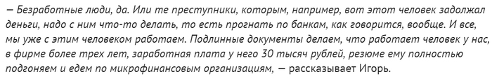 Игорю — назовем его так — уже давно может грозить срок за изготовление липовых документов. За вознаграждение — это 50% от размера займа — он готов виртуально трудоустроить в свою компанию людей, которые давно во всех черных списках, и никто им не даст деньги под проценты.