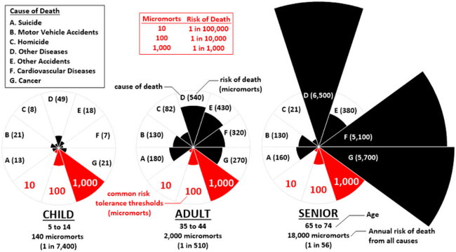 Ещё для порядка подчеркну важное — это среднее значение, основанное на аппроксимации имеющихся данных. Но это тоже пули в наш барабан. Например, 1 дополнительная пуля — это: выпить 0.5 литра вина, выкурить 1.5 сигареты, проехать 9 километров на мотоцикле. В общем, понятно, что в этом случае для смерти без разницы: выпили вы поллитра или прокатились с ветерком на железном коне. Но если ваша норма — 5 литров в сутки, то добавьте 10 пуль к тем 38 в барабане в конце дня. Так что страховикам нужно просто собрать ваш анамнез по жизни: курим 10 сигарет, пьём по литру пива, катаемся на мотоцикле 100 километров и всё это в один день — вот у тебя шансы на смерть выше, чем у человека со здоровыми привычками из твоей же категории. И надо подумать — стоит ли страховать жизнь такому человеку. Хотите взойти на Эверест — 37 тысяч «пулек» за подъём в барабан. Один широк героином — 30 зарядов (это просто вероятность того, что в процессе укола вы умрёте). Банально встать с постели в 90 лет — 464 микроморта. Первый день после рождения — целых 430. Встретить кенгуру — 0.1. Сесть на стул — 1.3 (сядьте на стул 769231 раз подряд и вам не жить). Высадиться на Луну — 0. Поездка на поезде принесёт 1 пулю на 9700 км. Самолёт — на 1600 км. Просто узнаём, сколько смертей было в процессе совершения действий, и подгоняем к миллиону (никто не умер от посадки на Луну, а вот дорога до вершины Эвереста засыпана трупами).