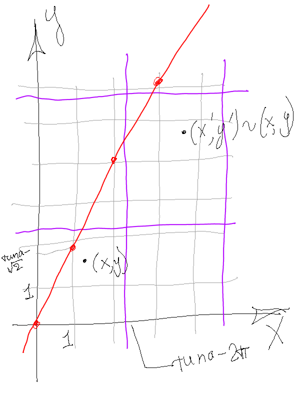 Наше множество — это жирные красные точки (n, √2n), n∈ℕ₀. И нам нужно доказать такое: если их все заэквивалентить в один квадрат 2π×2π, получим плотное множество. А для этого действуем так.