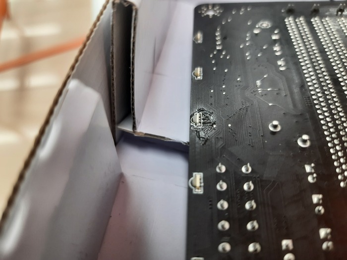 - 7-го числа приступил к сборке ПК. Он не включился. Разобрал и всмотрелся в сокет через лупу - увидел петлёй загнутую ножку на краю. Невооружённым взглядом её почти не видно, разве что при хорошем освещении и под определённым углом. При упаковке заметил на креплении сокета термопасту (покупал у них же, была жидкая и капнула). Стирая пасту случайно зацепил несколько ножек (моя ошибка) - слегка сместились.