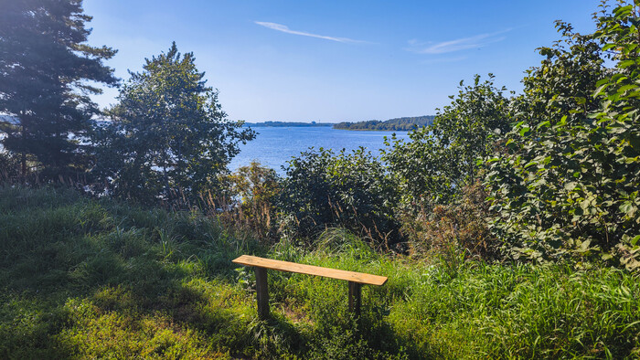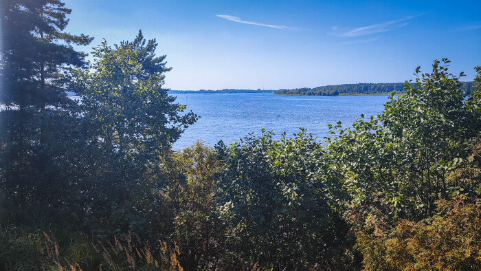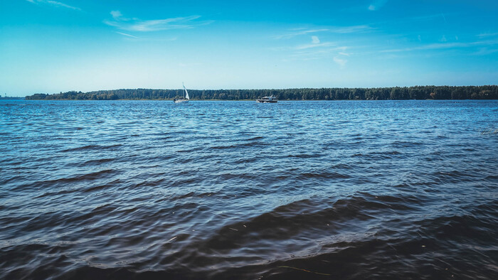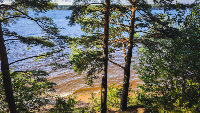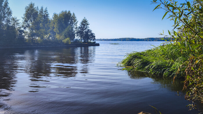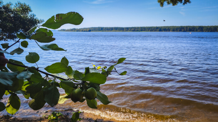 Внутри вижу понтон и бетонную на бережную. Кто-то играет на волейбольной площадке, но основной шум слышится на пляже на берегу. Такая жара стоит - грех не покупаться. Возможно последний жаркий день в году.