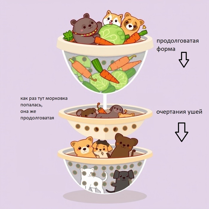 В первое сито засыпается всё, что есть. Но сквозь него проходят только определенные вещи. Во второе попадает то, что не задержалось в первом, и т.д. Каждое сито отсеивает по определенному признаку.