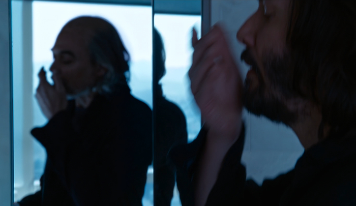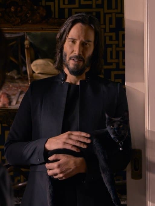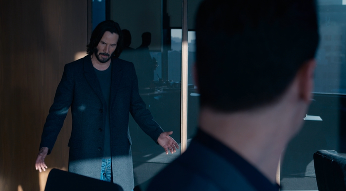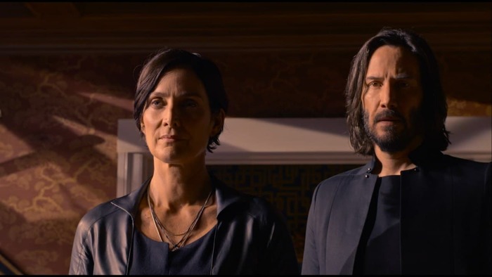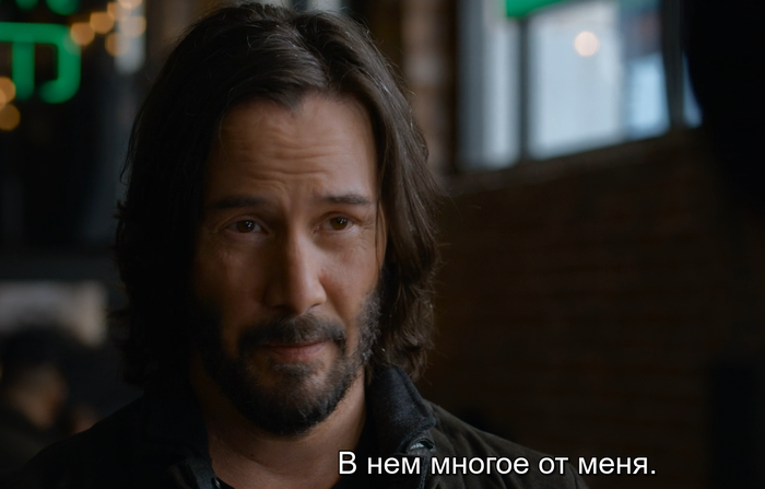 Постаревший киану ривз сидит за монитором и наблюдает за развитием революционной игры-симуляции "Матрица".
