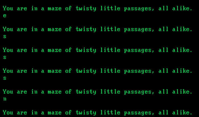 Это отсылка к «Colossal Cave Adventure», также известной как Adventure или ADVEN. Это текстовая компьютерная игра в жанре квест, старейшая в этом жанре. Первую версию Colossal Cave Adventure разработал в 1975 году для мейнфрейма PDP-10 программист и спелеолог Уильям Краудер. В ней среди прочих появлялось такое сообщение: «You are in a maze of twisty little passages, all alike.» («Вы в лабиринте похожих друг на друга извилистых узких проходов.»)