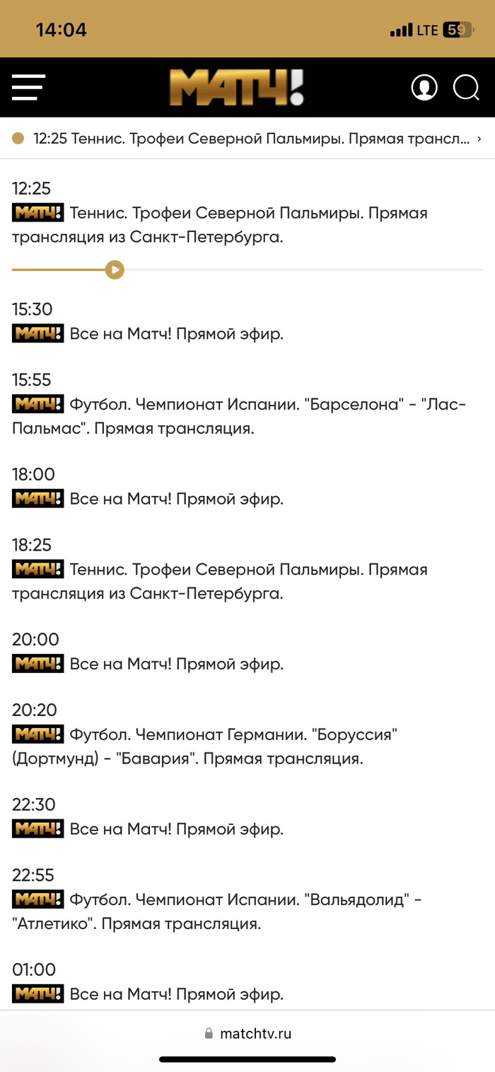 Для примера, я зашел на сайт Матч и вижу, что сегодня идет турнир по теннису, матч чемпионата Испании, потом снова теннис, потом чемпионат Германии, а затем снова матч чемпионата Испании. А перерывах между этими событиями в эфире идут студийные передачи.