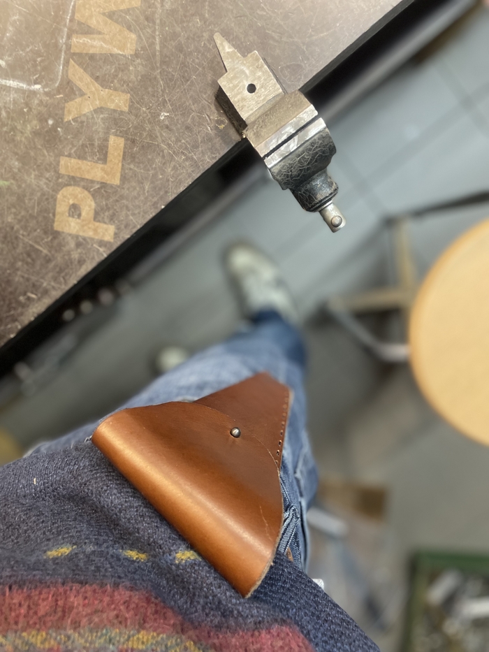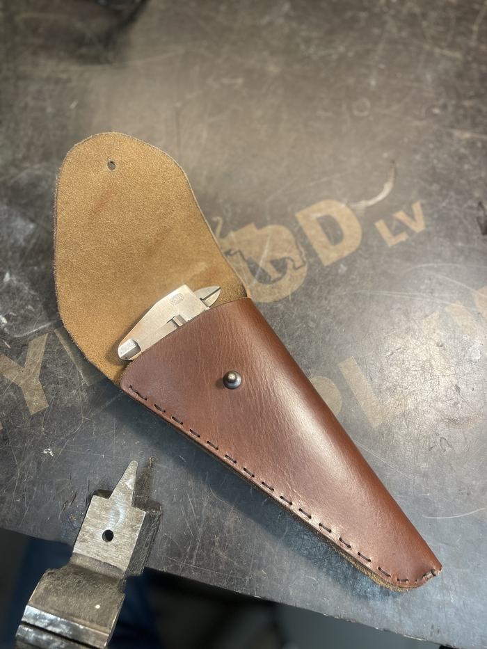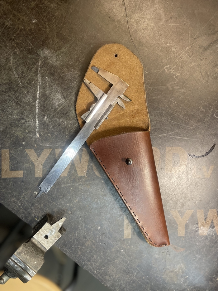 Сделал себе кожаный чехол/кобуру для штангенциркуля фирмы Mauser. С кожей работал первый раз, отверстия под нитки пробил самодельным заточенным цилиндром. Крепление для ремня выгнул из плоской нержавейки, «замок» выточил из бронзы на токарном станке и затемнил его специальным раствором для патинирования.