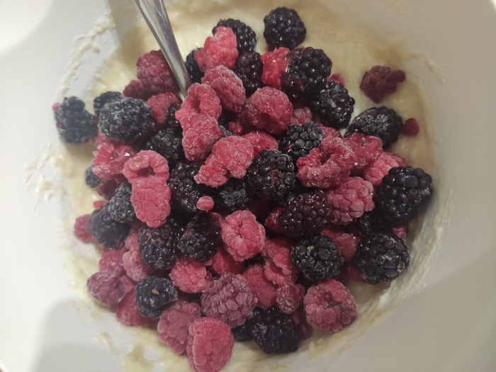 Ягоды можно брать и сырые. В обоих случаях, я их предварительно обваливаю в муке, чтобы тесто не отсырело.