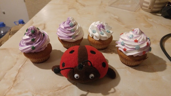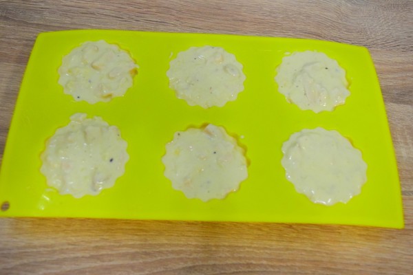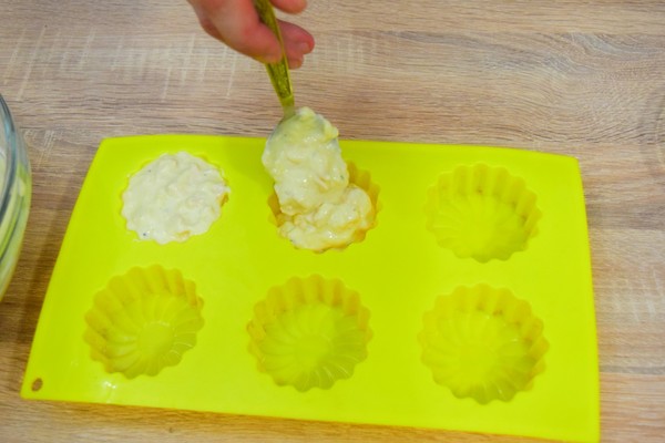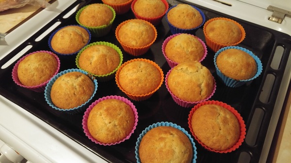 После замешивания теста раскладываем по формочкам (у меня силиконовые, можно и бумажные. Лучше использовать с укреплённым верхом чтоб не расползались и держали форму) и отправляем в кулинарный крематорий духовку. Печём их 20-25 минут. Готовность проверяем зубочисткой или по наличию румяности. На выходе получается вот такая штукенция