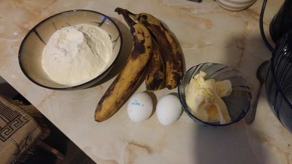 3 банана (очень спелых таких и мягких), 2 ыычка, 113г. (именно вот такое странное число ибо рецепт забугорный и там вообще в унциях) масла, 1 чайная ложка разрыхлителя, 1/4 чайной ложки соли и соды и 200г. сахара (на фото его нет ибо я лопата и сахара у меня не оказалось - пришлось топать в магаз и сфоткать забыл).