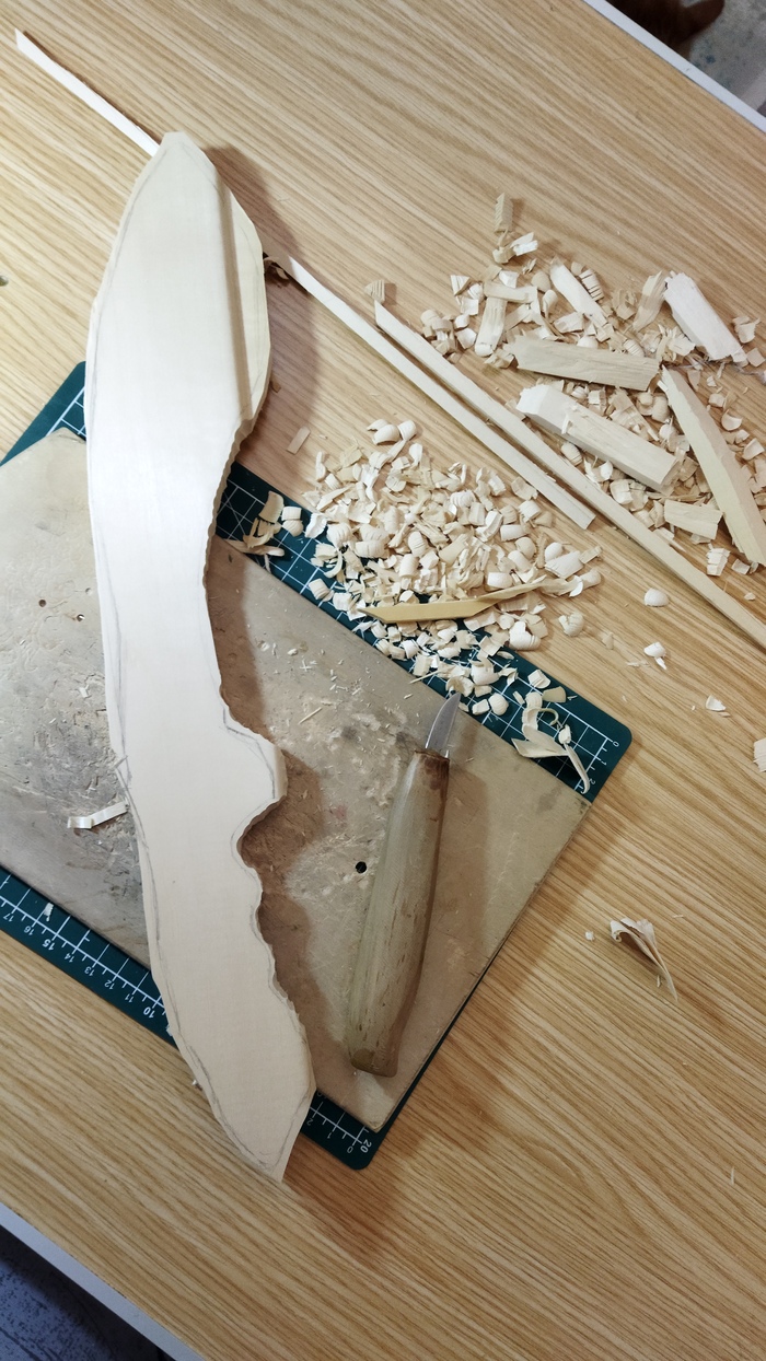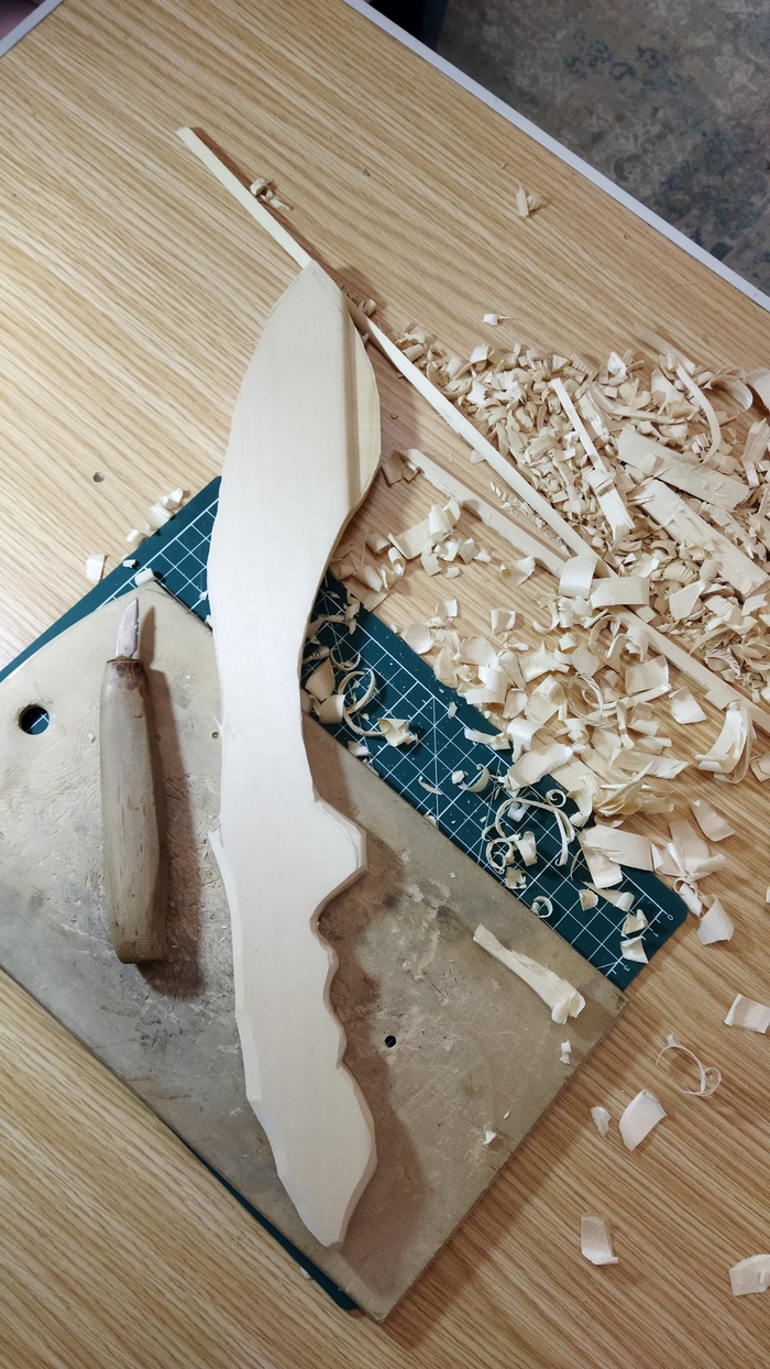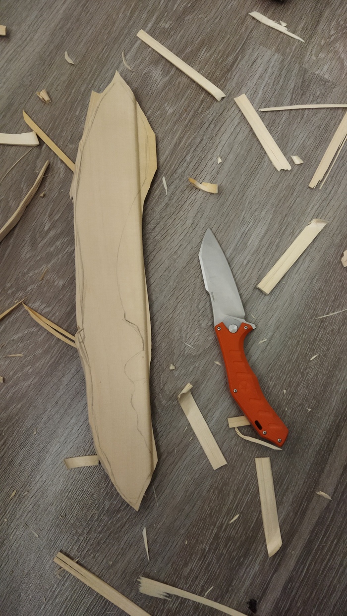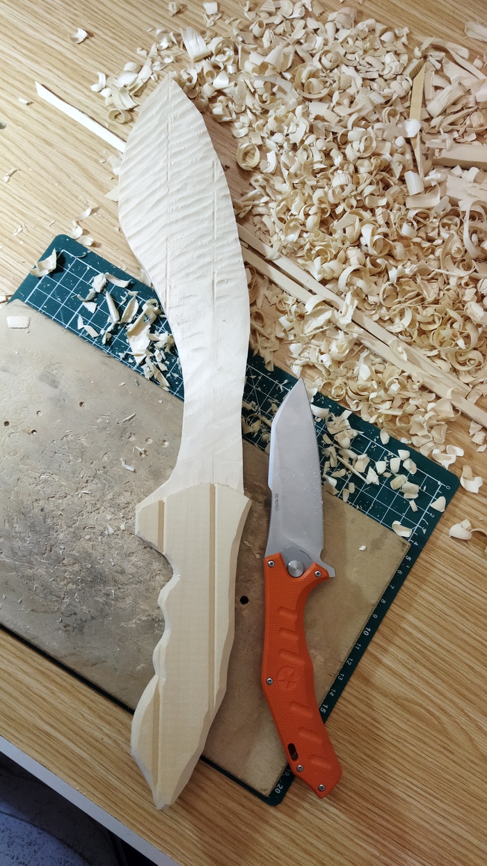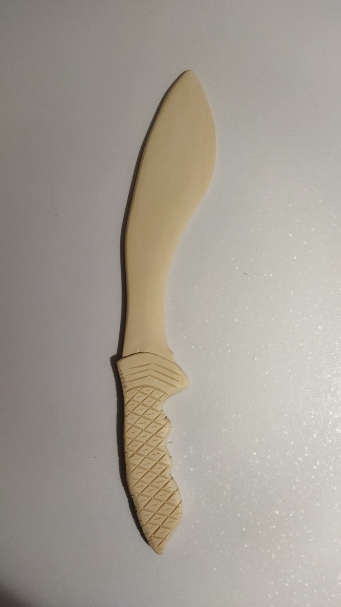 Рукоять получилась откровенно асимметричной формы, но прекрасно лежит в руке. Плюс сформировался наиболее любимый мной баланс - на два пальца от рукояти.