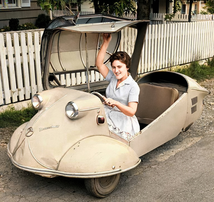 На этой фотографии запечатлена счастливая обладательница автомобиля Messerschmitt KR175 1955 года