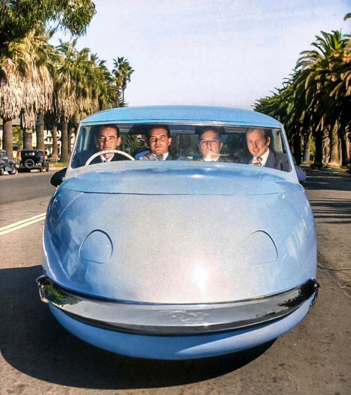 Четыре человека тестируют новый трехколесный автомобиль компании Davis Motor Car Company на улицах Лос-Анджелеса в 1947 году.