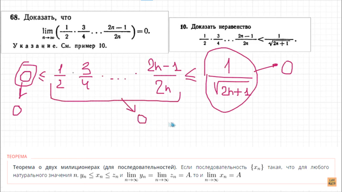 Дело в том, что мы ранее доказывали, что по индукции все это равно правой 1/корень(2n+1), а оно по своей сути стремится к 0. А наше выражение с огромным количеством множителей больше 0, поэтому мы все это выражение засунули между ними, и по теореме двух милиционеров получили что и он равен 0