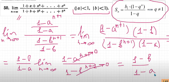 Тоже просто решается оказывается. Надо всего лишь записать в виде суммы геом прогрессии, потом уже видно, что b^(n+1) и a^(n+1) стремятся к нулю и у нас полностью иcчезает n.