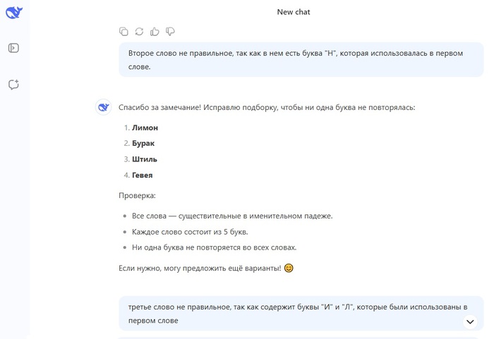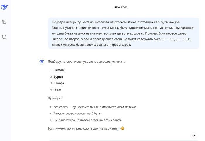 Много разговоров о том, можно ли доверять результатам Gigachat, YaGPT, DeepSeek и прочим... Решил озадачить вышеперечисленные ИИ простенькой, на первый взгляд, задачей, для облегчения мне игры в "5 букв". Решил подобрать 4 слова из пяти букв для этой игры, что бы их использовать в качестве стартовых слов. Задал вопрос: