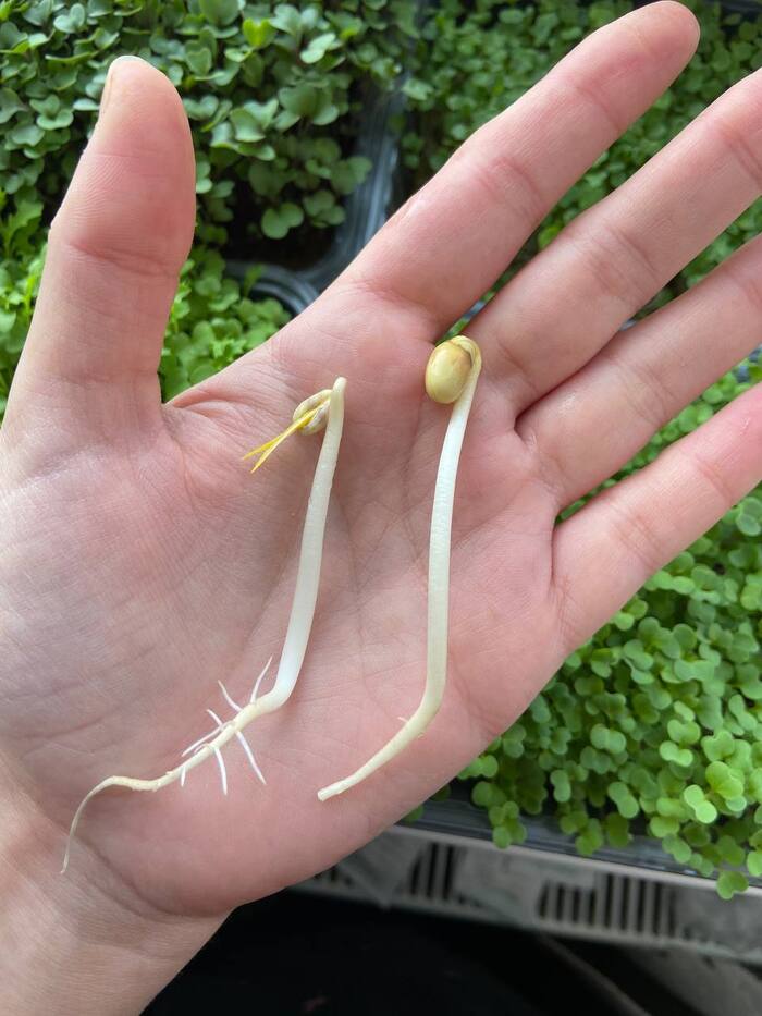 Единственное, пока занималась корнями, успели поймать солнечного утреннего света от окна, немного слегка позеленели семядоли у сои и немного насыщеннее желтые листики стали у маша
