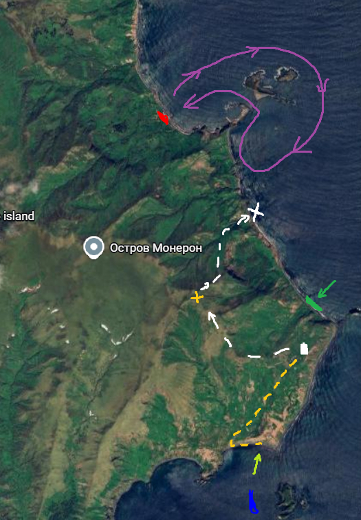 6. Стрелочка от судна к берегу и далее желтый пунктир от моря до станции - это место высадки и дорога к станции около 2 км в гору (уже было в прошлом посте)
