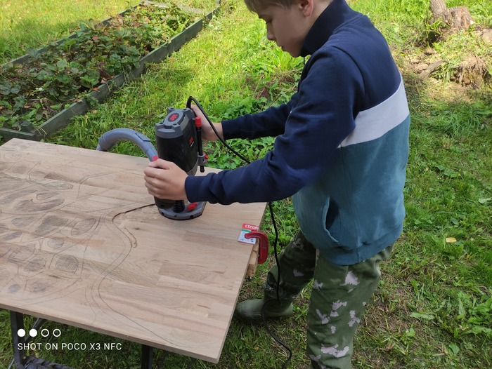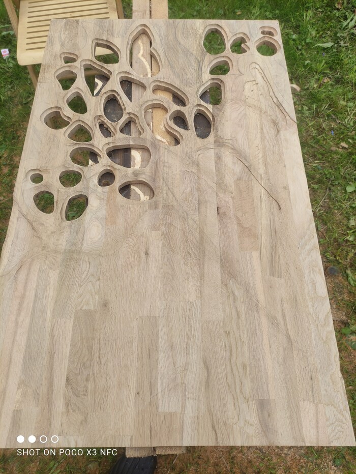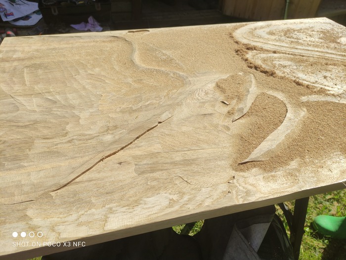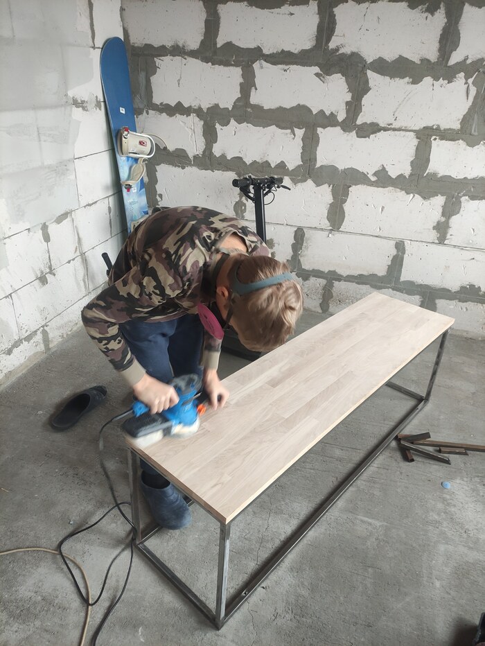 Берутся деревянные кухонные фасада, снимается старый слой лака и поверхность зачищается шлифмашинкой и абразивом.