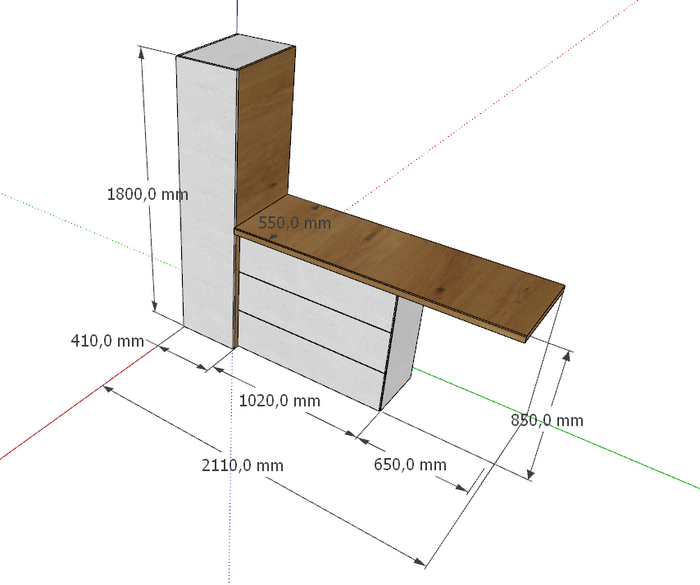 Зачастую замер и проектировка может являться чуть ли не более сложным этапом, чем само изготовление мебели. По идее заказчика слева должен располагаться пенал, а справа тумба с выдвижными ящиками и дубовая столешница. Такой был первоначальный дизайн:
