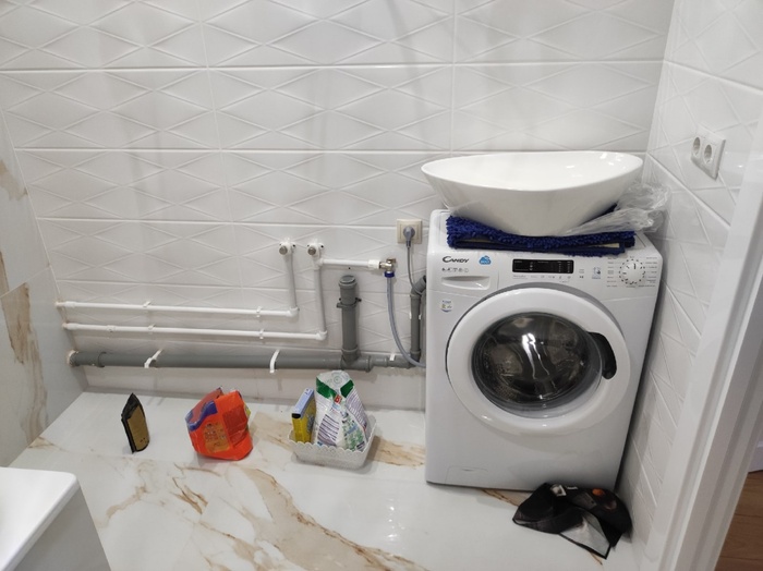 1. Как видно на фото, столешница должна проходить над стиральной машиной. Высота стиральной машины 840 мм, оставляем минимальный зазор 10 мм до столешницы, сама столешница 40 мм и получаем высоту в почти 900 мм до начала раковины. При этом заказчик желал использовать накладную раковину. Та раковина, что ему приглянулась имеет высоту 140 мм. В итоге мы получаем рабочую высоту раковины в 1030 мм - ее можно будет нормально использовать только при росте 190+ см.