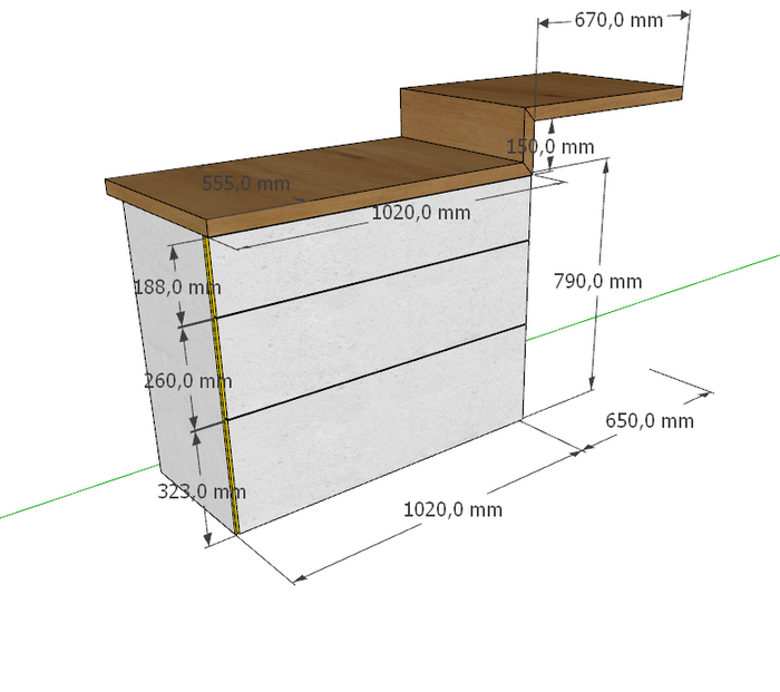 Основными изменениями стала двухуровневая столешница и изменения тумбы с ящиками. А теперь чуть подробнее остановлюсь на модулях.