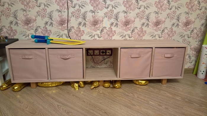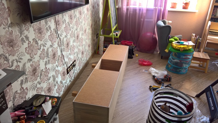 Модуль с выдвижными ящиками и столешницей. Используются те же опоры, сам модуль на 100 мм меньше по глубине чем столешница. Таким образом нам не мешают коммуникации и мы сможем спокойно подключить раковину. Щель с правой стороны будет закрываться стиральной машиной. Используются обыкновенные нажимные направляющие скрытого монтажа. И вот тут возникает проблема: для потребителя это красивые фасады без ручек, которые открываются при нажатии; для меня - головная боль. Эти направляющие очень чувствительны к геометрии изделия, что в данном случае не проблема, так как тумба из лдсп; но они еще и чувствительны к ширине ящиков.