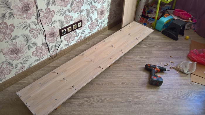 Самый обычный пенал, за исключение того, что боковая стенка будет из дубового щита. Все коммуникации закрываются конструкцией из лдсп и задней стенкой. Те, кто связан с производством корпусной мебели возможно обратили внимание на узкие нижние планки. В этом проекте было решено использовать опоры скрытого монтажа integrato. Они позволяют ставить модули таким образом, а регулируются через отверстия в нижней полке.