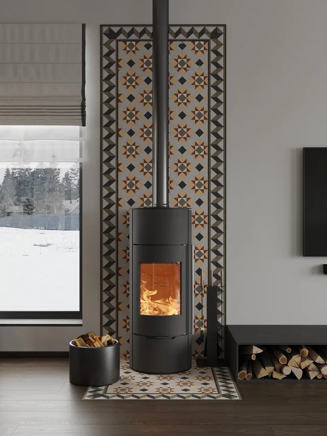 Камин выделили панно из метлахской плитки, которое переходит с пола на стену — это решение визуально связывает объект с остальным пространством. Вместо привычного журнального столика — низкий металлический каркас с деревянной столешницей.