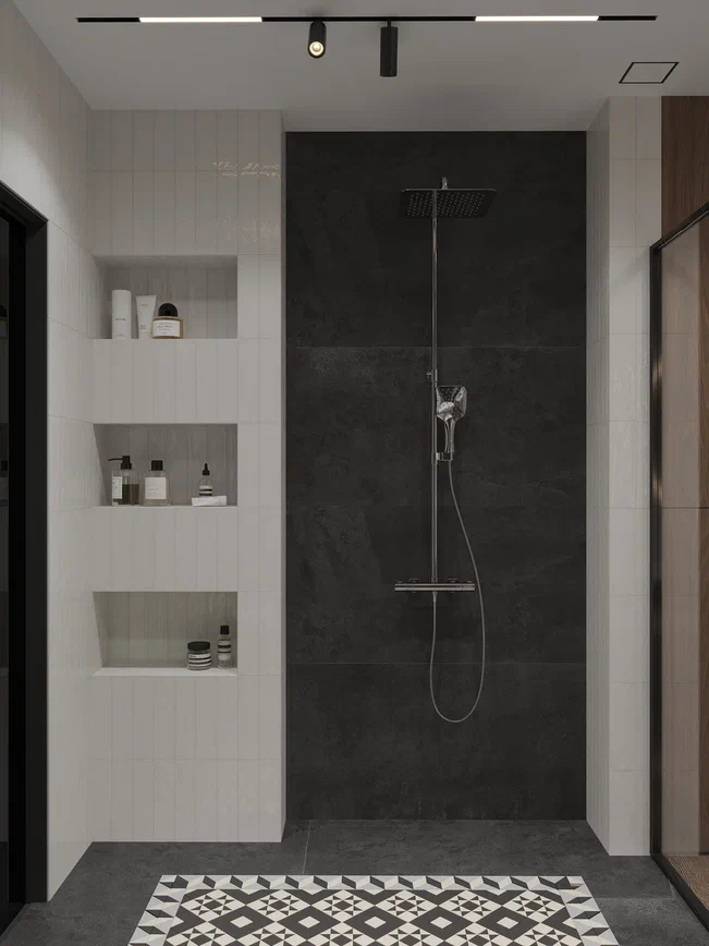 Гостевой санузел оформлен в графичной палитре с акцентом на выразительные фактуры и геометрию. В душевой зоне использована белая плитка с вытянутой гексагональной формой, а пол в душевой выложен плиткой с геометричным рисунком, напоминающим традиционные орнаменты.