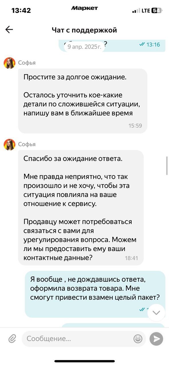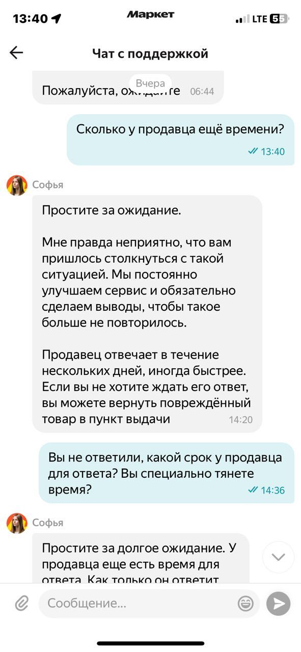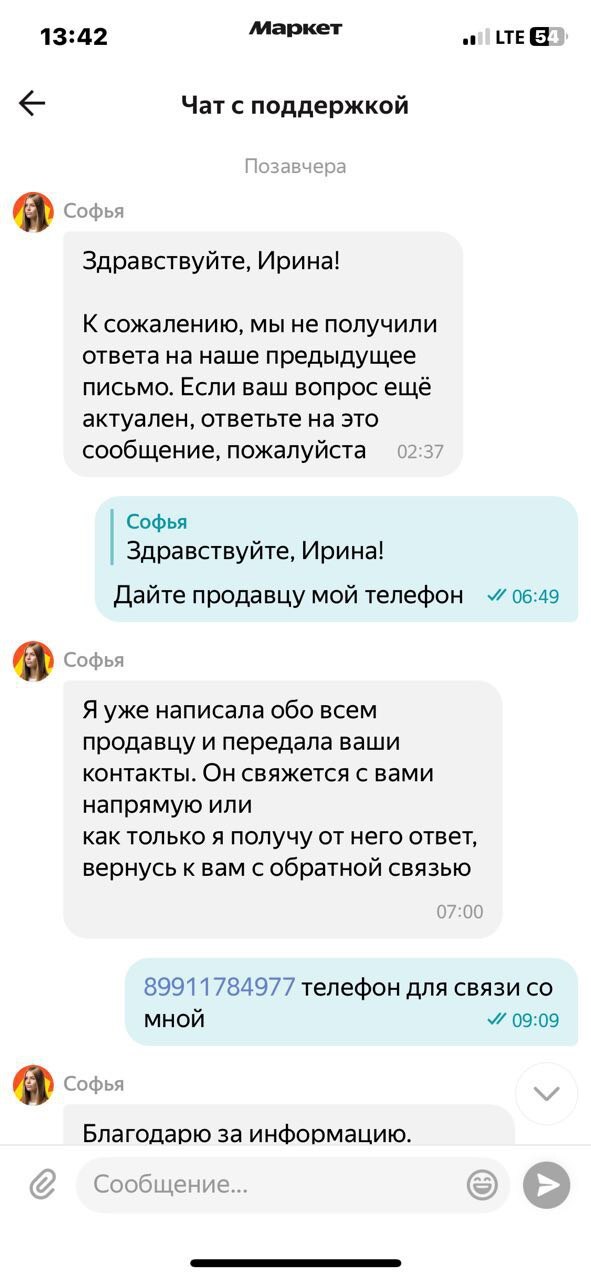 25 февраля - 9 марта: пишу в поддержку ЯМ в приложении, во Вконтакте, в почту, звоню по номеру горячей линии: + 7 495 136 37 96, прошу привлечь внимание к проблеме, через оператора оформляю жалобу на сотрудников поддержки, продавца на площадке - никакого результата