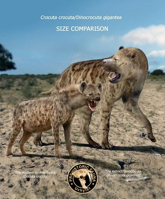 Пещерная гиена, подвид пятнистой, также была широко распространена на большей части Евразии: от Пиренейского полуострова до Сибири. Она была крупнее современных гиен. Если современные гиены вырастают до 80 кг, то пещерная могла весить и более центнера. Большим хищникам — большая жертва. Вероятно, основным рационом пещерных гиен являлись лошади. Но только там, где им в падаль не попадались мамонты или другие очень крупные животные. Интересно, да. Пещерным гиенам приписывают образ жизни падальщика, как когда-то его приписывали и пятнистым гиенам. Однако сегодня про пятнистую гиену узнали много нового. И возводят её чуть ли не в статус самого успешного охотника африканских саванн. Может, и пещерная гиена не обгладывала мёртвые туши носорогов, а сама на них охотилась? Интересно! Но пещерная гиена не единственная крокурта плейстоценовой Европы. Гигантская короткомордая гиена — самый крупный вид пахикрокут и в целом гиен. Пахикрокуты вырастали до размеров небольших львиц и весели около 110 кг. В Азии они вымерли 500 00 лет назад.