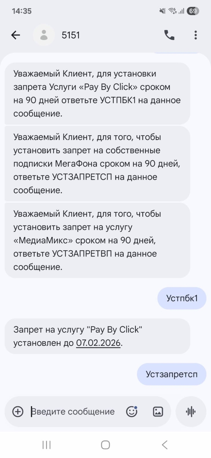 Пожаловалась мама что быстро расходуется баланс (Мегафон). Проверил - подписка висит 35р/день, онлайн порно кинотеатр. Неоднократно были уже темы здесь. Просто хочу напомнить - проверьте подписки у своих близких. В мегафоне сказали что вернут деньги за 60 дней. Перед этим они подключают услугу 800р заём - будь на связи, чтобы человек сразу не заметил перерасход. В итоге вернули 2450 - с августа , хотя подключена была в июле - 385р зажали. Внизу прикладываю фото с командами запретов на подписки.