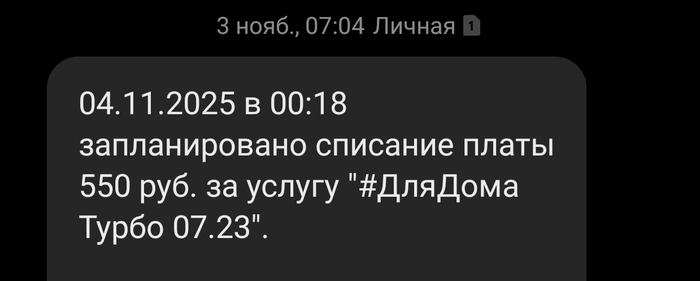 1. прислали СМС о подключении МегаСилы, которую я у них не заказывал, а именно - "безлимит на видео" когда Ю-туб смотреть невозможно нормально, а другие площадки меня не особо интересуют.