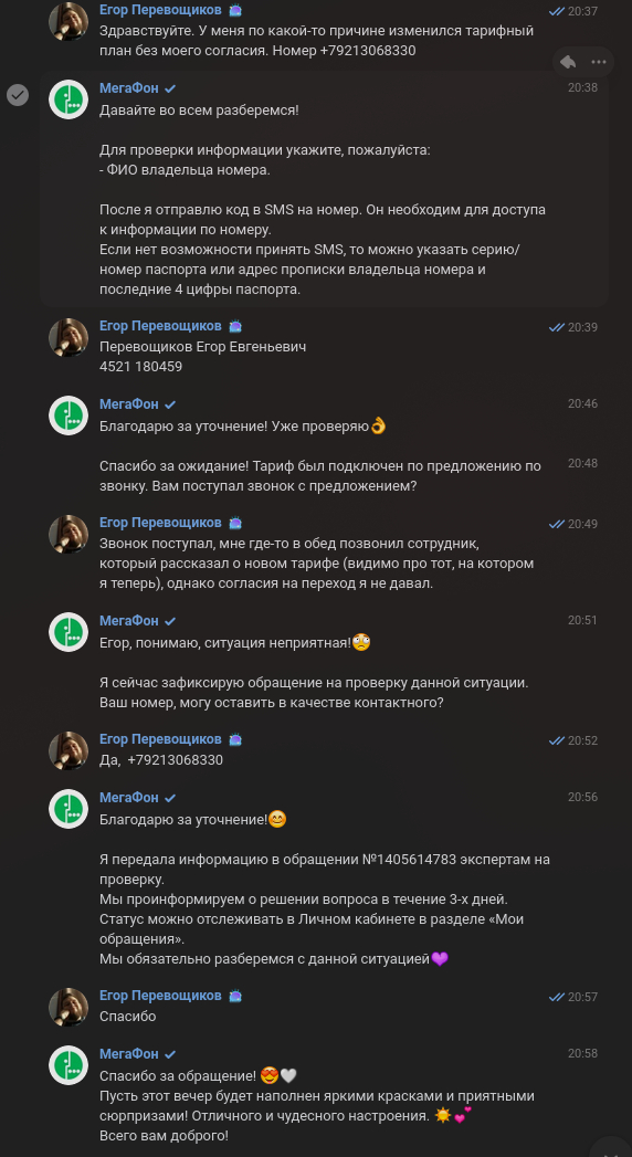 17.11.2025 в районе 12 часов мне позвонил представитель МегаФон, рассказал о новом доступном тарифе. Я его послушал, но предложение меня не заинтересовало. Вечером того же дня мне пришло уведомление, что мой тарифный план изменён, т.е. без моего согласия.