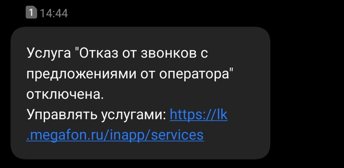 Оказалось, что я не от услуги рекламы отказалась, а наоборот, подключила доп услугу отказа. Да хоть как это назовите, но. С чего вдруг мегафон решил, что я передумала и соскучилась по ним? С этим вопросом пошла в чат поддержки пробиваться к операторам, ибо робот их настроен так, что на четко сформулированный вопрос о конкретной услуге спрашивает, нет ли у меня проблем с интернетом.