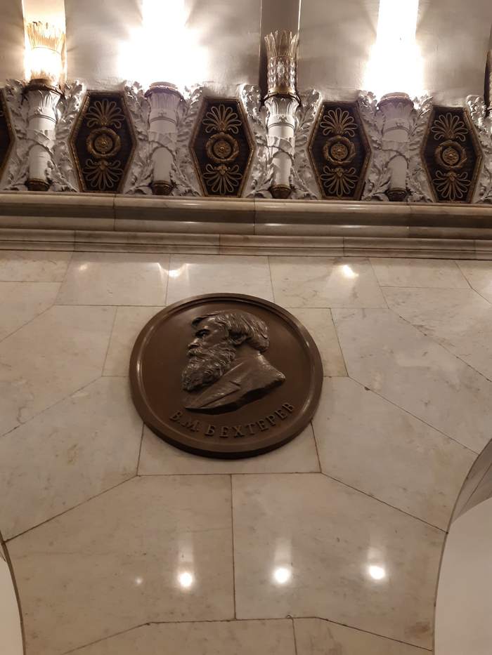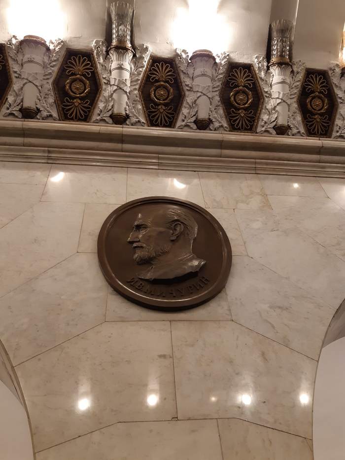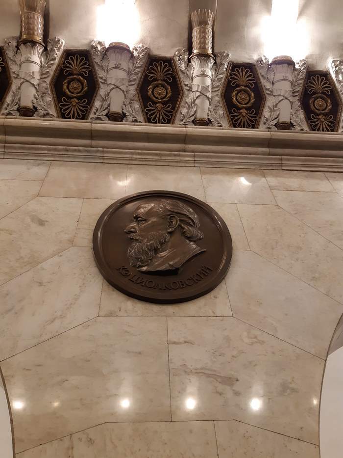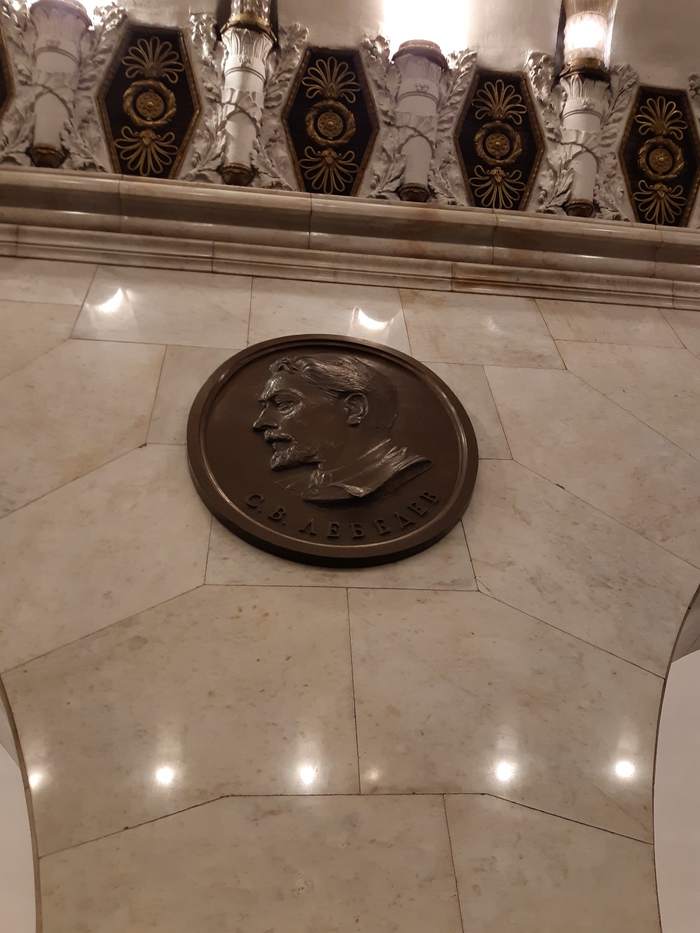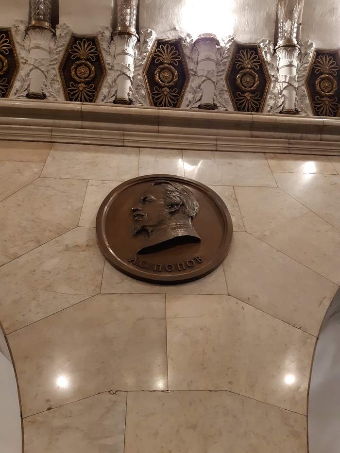 Первый зал метро Технологический институт. Медальоны. Основная тема оформления — достижения русской и советской науки.
