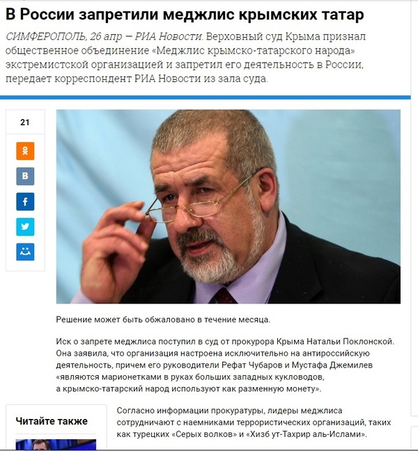 «18 апреля 2016 года в перечень общественных и религиозных объединений, деятельность которых приостановлена в связи с осуществлением ими экстремистской деятельности, включено общественное объединение «Меджлис крымскотатарского народа», — говорится на сайте.
