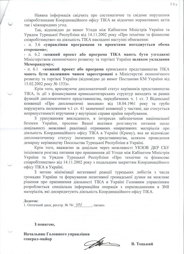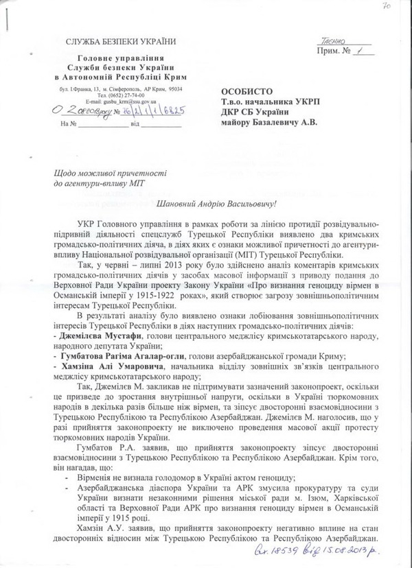 Из фотокопий документов под грифом «секретно» следует, что сотрудники СБУ на протяжении длительного времени вели наблюдение за деятельностью Джемилёва, тогда ещё главы «меджлиса», и выявили не только его связи с турецкой разведкой, но даже сделали вывод, что деятельность Джемилёва представляет угрозу национальной безопасности.