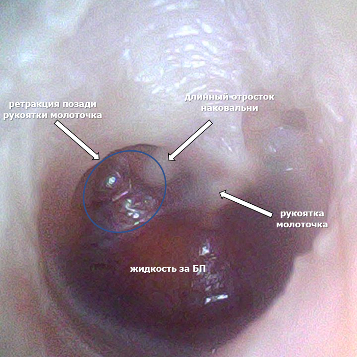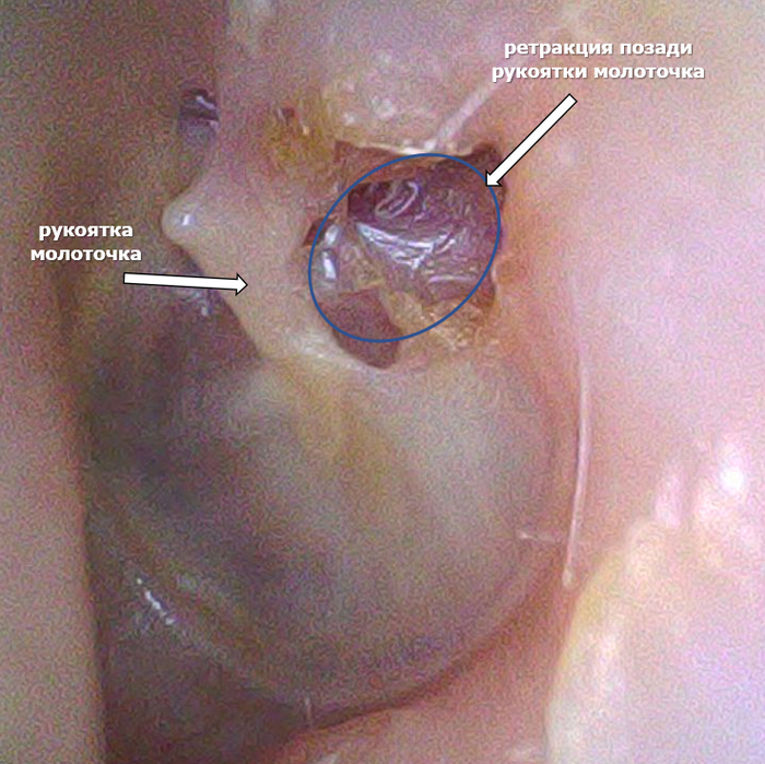 Первый пациент с снижением слуха в течение нескольких лет. Мы видим ретракцию (втяжение). Слух снижен из-за того, что в месте ретракции - должен быть длинный отросток наковальни, но его нет. Абсолютный кандидат на операцию! Из опасненького - дно ретракции лежит на канале лицевого нерва, который иннервируют мышцы лица. Если ничего не делать, то вопрос времени когда лицо провиснет